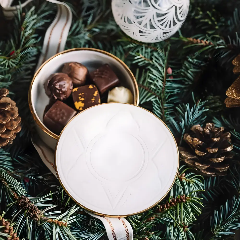 This elegant white Moroccan ceramic lidded box styled with Christmas pine branches is the perfect vessel for luxury chocolates, truffles, or small gifts — a sophisticated alternative to traditional gift boxes.